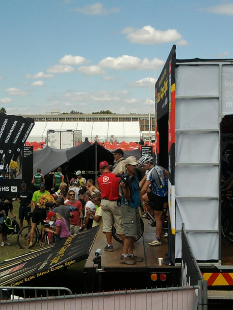 Monday Today we had the team presentation and team meeting. The presentation was short and sweet with a bit of a tv thing with Johnny Koen to get our sponsers some good coverage. After the presentation we all sat down for a quick meeting to discuss plans for the upcoming days. Dean had been on a course of antibiotics for the few days leading up to the event and made the call not to ride that morning. This allowed Silvio Bundi(world class mountainbiker and past Cape Epic winner) to join the team. We were also fortunate to have Thomas Zahnd riding with us, Bundi’s epic partner this year and Shaun Ward formerly of Konica Minolta and blue jersey wearer of the 2008 giro. Our backup crew for the race consisted of Cliff Hopf(manager), Dean Hopf and Matt Wentworth(the helper boys 🙂 ). Our team thus looked as follows: Matthew Evans Chris Wolhuter Silvio Bundi Thomas Zahnd Shaun Ward Craig Butland