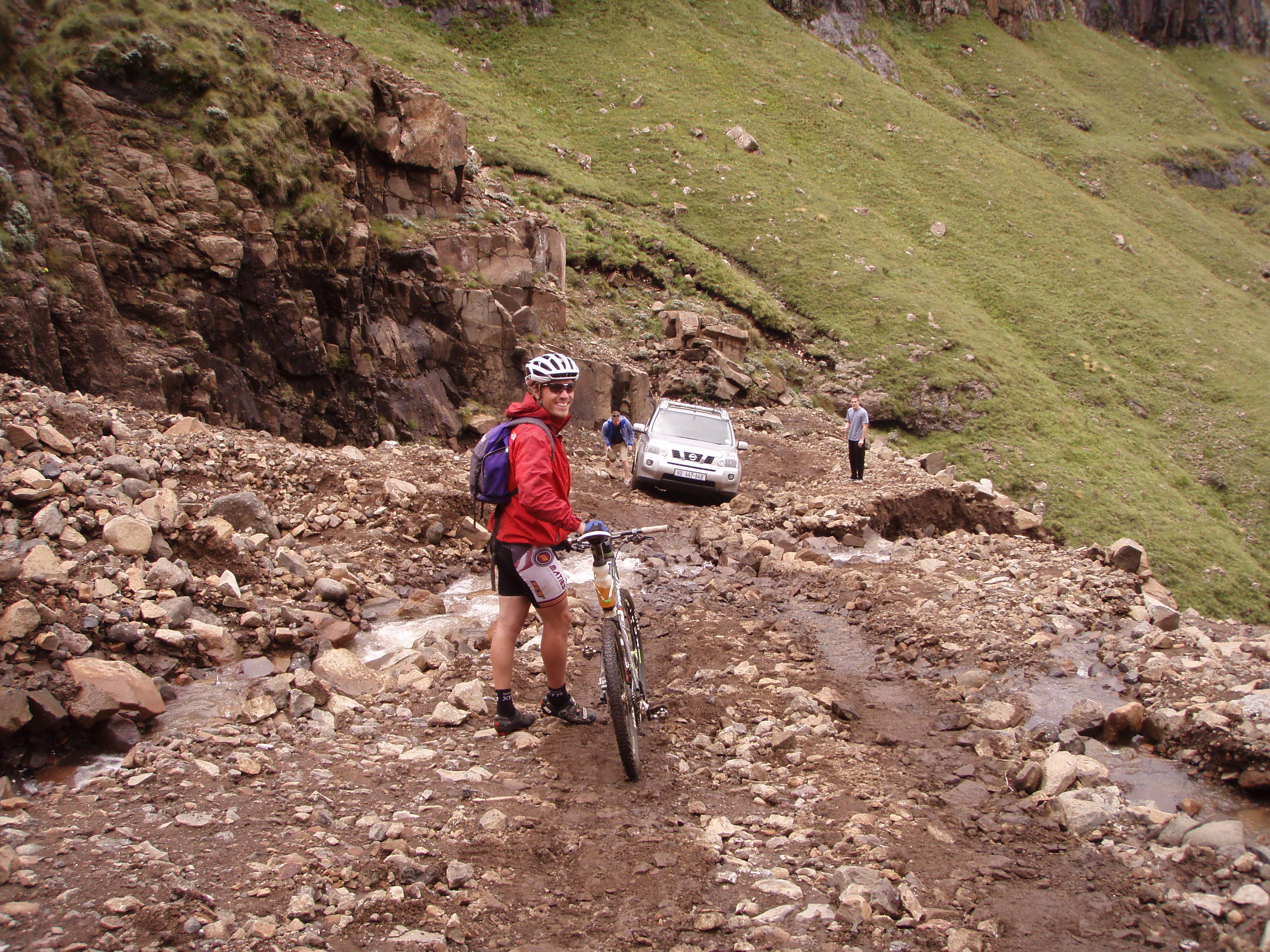 An awesome sunrise greeted us on our 2nd unplanned morning at Molumong Lodge. Our plan for the day was to ride back to Sani Top Chalets but first we would have to deal with the issue of the washed away road. Christiaan and I set off first and the car met us at the point where the road had washed away. Our new strategy was to cross the river in a different point where the water was a bit shallower. We used rocks to build the level of the river bed up a bit and then Mike would try drive across. After about an hour of this we decided that it was worth a try. After carefully lining up the car Mike went for it, carefully through, he made it! We walked across with the bikes after and we then each set off for Sani Top.