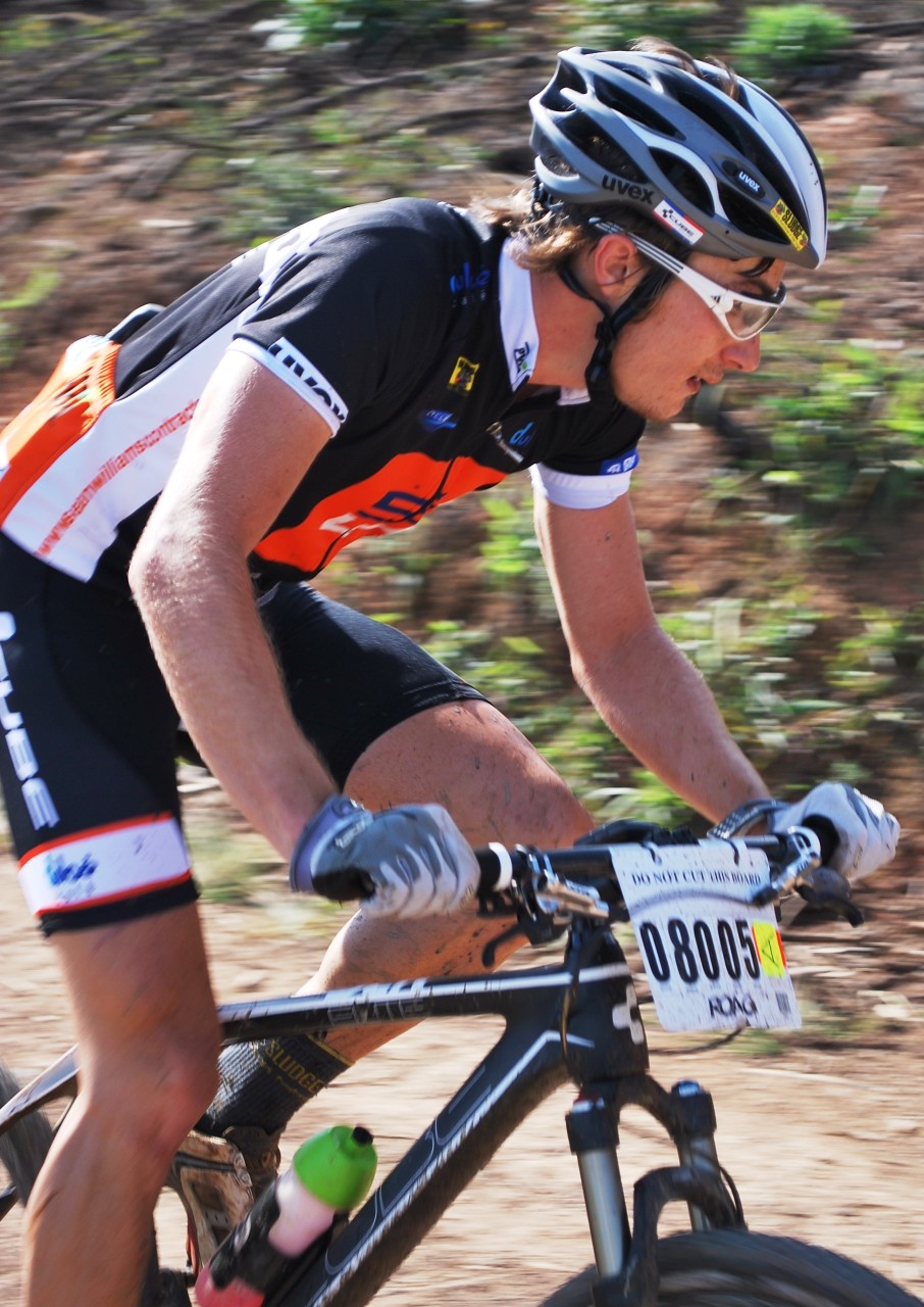 On the first significant climb Rourke Croeser(Orange Monkey/Cannondale) pushed the pace and a group of 6 riders went clear including myself, Tyronne White, Patrick Belton, Brendon Davids(Jeep) and Evan van der Spuy(Jeep). We stayed together until a short sharp rise where Rourke got away on his own, followed by Tyronne and Brendon and then myself, Evan and Patrick. Travis Walker soon joined the 3 of us and we worked well together in pursuit of Tyronne and Brendon.